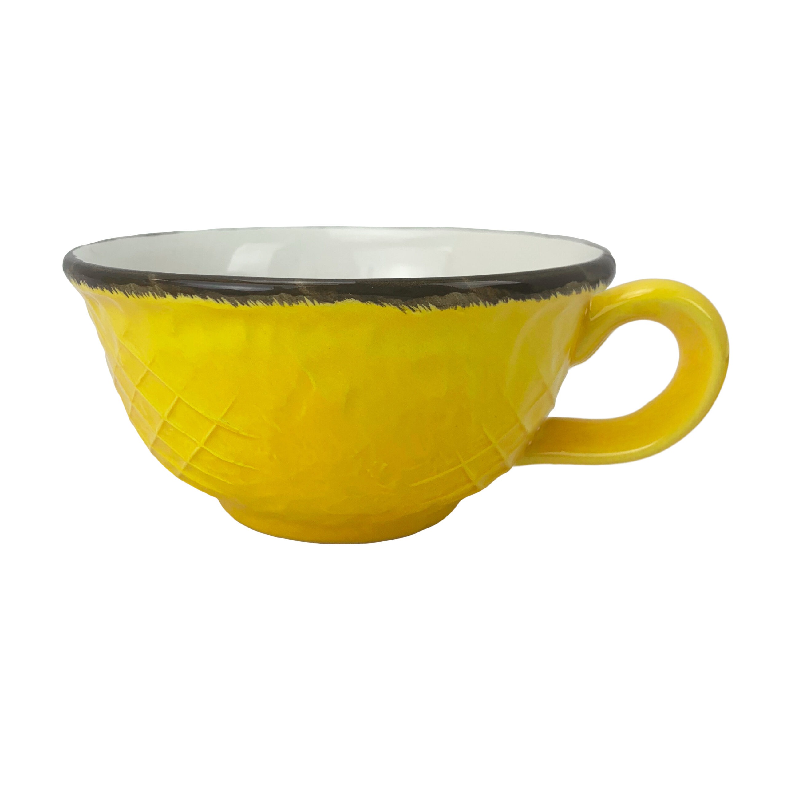 Le tazze della collezione Preta prendono il nome dal dialetto napoletano “preta”. Per richiamare le origini napoletane degli Arcucci e alla pietra quindi si ispira questa collezione, superficie e forma irregolare. La sua matericità è esaltata dalla brillantezza degli smalti dai colori sfavillanti e molto resistenti, prodotti, come tutti i singoli componenti, interamente a mano in Italia. La nostra collezione Preta si veste a festa, dopo la verniciatura a spruzzo, viene eseguito a pennello un bordo in oro vero che conferisce alla collezione una maggiore eleganza e personalità. Uno stile “Casual-Chic” , un tocco sofisticato ma pratico per una tavola quotidiana dalla personalità spiccatamente Italiana. Ogni procedimento è realizzato a mano rendendo unico e irripetibile ogni singolo oggetto. Le tazze Preta sono disponibili in 12 colori: giallo, arancio, rosso, lilla, acquamare, turchese, nero, grigio, latte, cipria, bosco e dal 2023 anche il colore fango!
